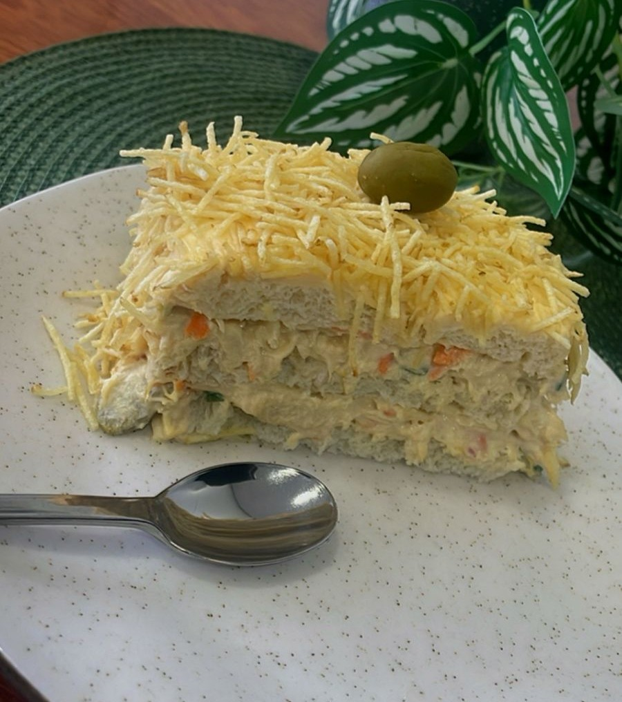 Fatia deliciosa de Torta de Frango, feito com Peito de Grango Desfiado e muita hellmann's! E para completar Batata Palha e Azeitona por cima.